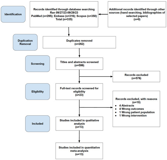 The database searches of PubMed, Embase, and Scopus yielded 295, 316, and 350 results, respectively. After removal of duplicates, the final number of studies included for screening of titles and abstracts was 599. A total of 262 duplicates were removed during importation. After title and abstract screening, the total number of studies was 23. Full-text review narrowed this number down to 13 studies that fit our inclusion and exclusion criteria. Data were extracted from these 13 studies. The PRISMA flowchart in Figure 1 illustrates the above process of importation, screening, and data extraction of the studies included in the meta-analysis.