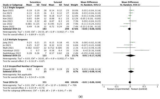 A meta-analysis of the data extracted from 13 studies comparing the final recorded BCVA showed that there was no significant difference between Yamane and SSF (MD = −0.01, 95% CI: [−0.06, 0.04], p = 0.73). There was significant heterogeneity detected (I2 = 70%, p < 0.0001). Because of this heterogeneity, we conducted a subgroup analysis based on the number of surgeons involved in each study. When these groups were stratified based on the number of surgeons, there was no significant difference in the final visual acuity between treatment groups in the single-surgeon study and the multiple-surgeon studies (Single surgeon: MD = −0.03, 95% CI: [−0.08, 0.03], p = 0.37; Multiple surgeons: MD = 0.01, 95% CI: [−0.17, 0.20], p = 0.87). Between subgroups, there was no significant heterogeneity detected (I2 = 0%, p = 0.64). The forest plot with a subgroup analysis is shown in Figure 2a. The number of Yamane and SSF cases per surgeon in the single-surgeon group were 26.1 and 29.9, respectively. The number of Yamane and SSF cases per surgeon in the multiple-surgeon group were 9.5 and 13.2, respectively. The pooled MD remained statistically insignificant with each study removed in the sensitivity analysis. A linear Egger regression analysis of funnel plot asymmetry did not detect any publication bias in the final BCVA results (p = 0.138, Figure 2b).