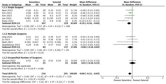 A meta-analysis of the data extracted from 10 studies comparing the BCVA at 1 month showed that Yamane had significantly better outcomes than SSF, with an average difference of 0.08 LogMAR (MD = −0.08, 95% CI: [−0.12, −0.03], p = 0.003). In multiple-surgeon studies, there was no significant difference between the two techniques (MD = −0.06, 95% CI: [−0.16, 0.04], p = 0.23). There was a significant difference between the BCVA at 1 month in the single-surgeon group (MD = −0.10, 95% CI: [−0.16, −0.04], p = 0.002). The forest plot with a subgroup analysis is shown in Figure 3. The pooled MD remained statistically significant with each study removed in the sensitivity analysis. There was no significant heterogeneity detected (I2 = 21%, p = 0.25).