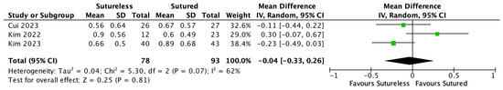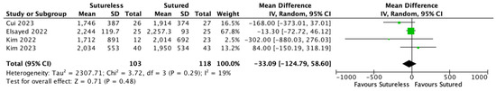 A meta-analysis of data extracted from four studies found there to be no significant difference between post-operative ECC between the Yamane and SSF techniques (MD = −33.09, 95% CI: [−124.79, 58.60], p = 0.48). The forest plot is shown in Figure 6. The pooled MD remained statistically insignificant with each study removed in the sensitivity analysis. No significant heterogeneity was detected (I2 = 19%, p = 0.29).