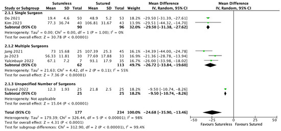 A meta-analysis of data extracted from six studies found that the mean surgical time was significantly shorter in the Yamane group than the SSF group by an average of 24.68 min. (MD = −24.68, 95% CI: [−35.90, −13.46], p < 0.00001). There was significant heterogeneity (I2 = 98%, p < 0.0001), so a subgroup analysis was conducted based on the number of surgeons included in the studies. In both the single- and multiple-surgeon subgroups, the Yamane group’s surgical duration was significantly shorter than SSF (Single surgeon: MD = −29.50, 95% CI: [−31.38, −27.62], p < 0.00001; Multiple surgeon: MD = −26.72, 95% CI: [−33.84, −19.60], p < 0.00001). The pooled MD remained statistically significant with each study removed in the sensitivity analysis. The forest plot with a subgroup analysis is shown in Figure 5. Mean Yamane durations ranged from 12.3 to 77.3 min. Mean SSF durations ranged from 21.8 to 107.39 min. The wide range of durations is due to some studies including pars plana vitrectomy in their surgical duration calculation and others not including it. The studies’ authors were consistent with reporting surgical duration in that either all cases included PPV or anterior vitrectomy in their calculation of duration or not. Therefore, the difference in surgical duration can be attributed to the difference between fixation techniques rather than the time spent on vitrectomies. We excluded Muth et al. from the surgical duration calculations because it was unclear if all patients were aphakic or underwent PPV prior to secondary IOL implantation [28]. The only source of variability in duration in these groups would come from the difference between Yamane and SSF.