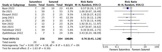There is no significant difference between the rates of cystoid macular edema (RR: 0.76 [0.45, 1.28], p = 0.30) between the two groups. There was no significant heterogeneity detected (I2 = 0%, p = 0.82). The forest plot of cystoid macular edema risk ratios is shown in Figure 7. There was also no significant difference between the rates of secondary surgical intervention (RR: 1.60 [0.57, 4.51], p = 0.38). The forest plot of secondary surgical intervention risk ratios is shown in Figure 8. The pooled RRs remained statistically insignificant with each study removed in the sensitivity analysis. There was no significant heterogeneity detected for secondary surgical interventions (I2 = 20%, p = 0.29). There were three post-operative cases of retinal detachment (RD) (1 in Yamane, 2 in SSF). Due to the paucity of RD and vitreous hemorrhage events, with the majority of studies reporting zero events in both treatment groups, an RR meta-analysis was unable to be performed. A summary of the cumulative complications across studies is depicted in Table 2.