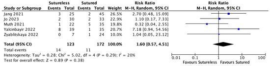 Forest plot of the risk ratio (RR) meta-analysis comparing rates of secondary surgical intervention between Yamane versus sutured scleral fixation. Each study is shown by the last name of the first author and the RR with 95% confidence interval (CI) [23,24,28,30,31]. The combined effect and 95% CI are also shown (according to random-effect estimations). IV = inverse variance.