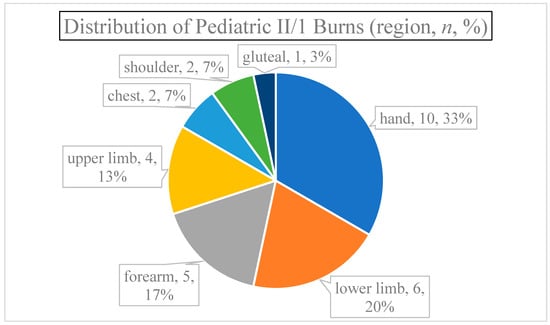 Figure 2.). It is important to mention that only two patients had larger than 5% TBSA injuries, therefore, most burns were small in area. Regarding depth, a single burn was classified as mixed depth—the rest were solely II/1.