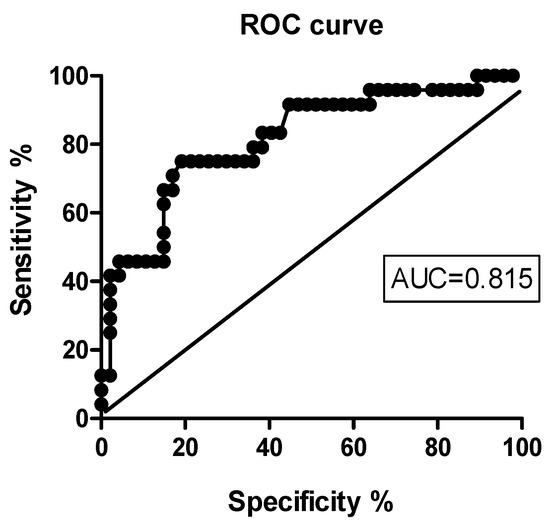 These results became the basis for analyzing the operational characteristics of the prediction of an early (at 1 month) clinical response to IIT, based on determining the total score on the LDS before the therapy. For this, a characteristic curve (receiver-operator curve, ROC) was constructed. Figure 1 shows that the area under the curve in this case was 0.815 (95% CI 0.70–0.92, p = 0.0001).