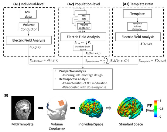 The tES-generated electric field is computed using a realistic human head model representing the tissue-dependent conductivity distribution (volume conductor model or current flow models based on individual-based or template-based head models). Electric field analysis is illustrated in Figure 1. This section presents the technical aspects of electric field analysis for tES.