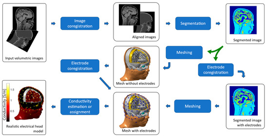 Generation of individual head models based on finite elements. The input images are aligned and segmented. The segmented image can be meshed to obtain the tissue surfaces, or the electrodes can be aligned to the segmented image and added to the segmentation before the meshing process takes place. The final mesh is typically composed of tetrahedral or hexahedral elements, filling the whole head volume. The electrical head model is completed by assigning electrical conductivity values to each tissue, either isotropic or anisotropic and homogeneous or inhomogeneous.