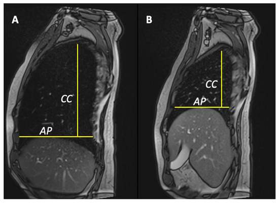 Anterior–posterior lung diameter delta was defined as the differential value between the maximum lung diameters in anteroposterior directions in maximum inspiration (A) and maximum expiration (B) True FISP scans. Anterior–posterior distance was considered as the distance between anterior and posterior chest wall, tracing a line passing through the top of the hemidiaphragm. Cranio-caudal lung diameters delta was defined as the differential value between the maximum lung diameters in cranio-caudal directions. Cranio-caudal distance was estimated as the distance between the A-P line and the top of the lung.
