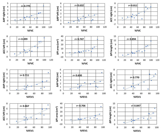 Moreover, we found a strong correlation between spirometry respiratory parameters and pulmonary measurements at dynamic MRI (especially comparing %FVC with ΔPIarea [r = 0.835; p < 0.001] and ΔPIlength [r = 0.894; p < 0.001]); all comparisons are reported in Table 2 and illustrated in Figure 2.