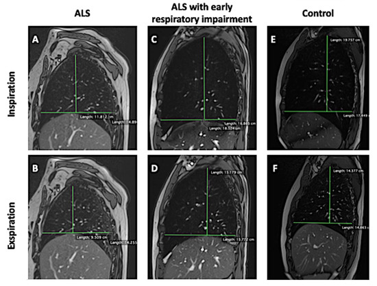 True FISP sagittal scans passing through the center of the right hemidiaphragm acquired at maximum inspiration and maximum expiration showing the differences in AP lung diameters, CC lung diameters, ΔAPr, and ΔCCr between an ALS patient (A,B), an ALS patient with early respiratory impairment (C,D), and a healthy control (E,F).