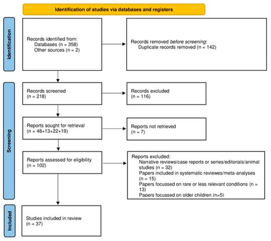 The search returned 360 results. No Cochrane reviews were found. Titles and abstracts were screened, and 37 were finally considered. An audit trail of the evidence is shown in Figure 1.