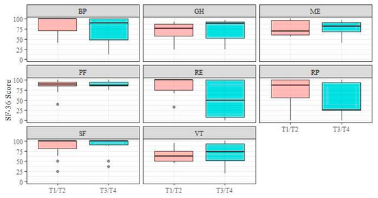 The 36-item Short Form Health Survey (SF-36) was used to assess the overall QoL [13,14]. The SF-36 items were categorised into eight subscales: “physical functioning” (PF), “role limitation due to physical health” (RP), “role limitation due to emotional problems” (RE), “vitality” (VT), “mental health” (ME), “social functioning” (SF), “bodily pain” (BP), and “general health” (GH). Scores for each subscale ranged from 0 to 100 (100 = best QoL).