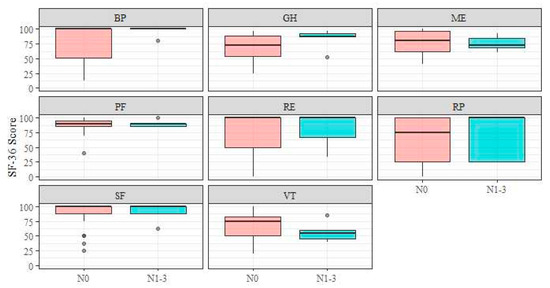 Short Form-36 subscales–N-stage. Abbreviations: BP, bodily pain; GH, general health; ME, mental health; PF, physical functioning; RE, role limitation due to emotional problems; RP, role limitation due to physical health; SF, social functioning; VT, vitality.