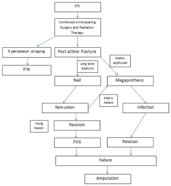 - Muratori, F.; Raspanti, F.; Scoccianti, G.; Innocenti, M.; Capanna, R.; Greto, D.; Mondanelli, N.; Campanacci, D.A. Treatment options in femoral radiation fractures following soft tissue sarcoma: Incidence, risk factors, failures and flowchart of treatment. Injury 2021, 52, 1597–1605. [Google Scholar] [CrossRef]