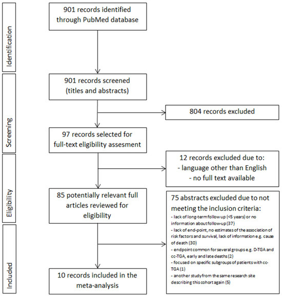 The PubMed database was investigated from its inception to 30 November 2022 to find studies of cc-TGA patients describing long-term mortality risk factors. While searching for relevant abstracts, we used the following phrase set: (congenitally corrected transposition of the great arteries OR cc-TGA OR systematic right ventricle) AND (death OR sudden death OR cardiac death OR sudden cardiac death OR outcome OR prognosis OR risk factors) AND (adults OR adolescents)). We did not establish any language restrictions or filters. The first investigator (SN) analyzed the entire database for relevant abstracts while excluding duplicates, from which 97 were selected for full-text eligibility assessment (Figure 1). After excluding 12 analyses due to no full text available and language other than English, investigators one and two (SN and EJ) reviewed 85 potentially relevant complete texts. Eventually, 75 records were excluded for the reasons listed in Figure 1. Therefore, ten studies met the inclusion criteria. Moreover, we reviewed the bibliographies of the included records in search of further potential research. All the studies involved in this analysis were approved by an appropriate ethics committee or institutional review board, and the patient consented to participate. We double-checked all the information included in our study by two investigators. Other team members (PR, ML, and OT) were responsible for substantive care, resolving debatable decisions, and reviewing the methodological correctness of this work.