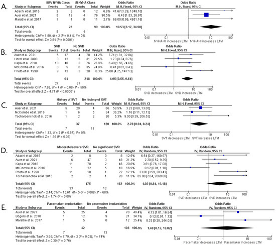 Forest plots showing pooled odds ratios of NYHA >II/heart hospitalization (A), at least moderate SVR (B), SVD (C), history of SVT (D), and pacemaker implantation (E) for long-term mortality using a random effects meta-analysis approach. Abbreviations: cc-TGA—congenitally corrected transposition of the great arteries; NYHA—New York Heart Association; SVR—systemic valve regurgitation; SVD—systemic ventricular dysfunction; SVT—supraventricular tachyarrhythmia [9,10,12,13,14,15,16,17,18].