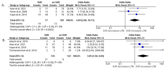 Forest plots showing pooled odds ratios of SVD (A) and history of SVR (B) for long-term mortality after surgical repair using a random effects meta-analysis approach. Abbreviations—see Figure 2A [9,10,13,14,18].