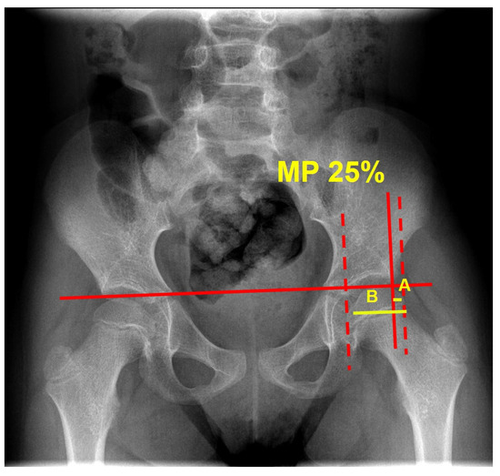 Example of an anterior–posterior radiograph of the pelvis with calculation of the migration percentage (MP): MP = A/B × 100. A represents the portion of ossified femoral head laying lateral to Perkin’s line (vertical line drawn through the lateral acetabular margin and perpendicular to Hilgenreiner’s line, which passes through the superior aspect of the triradiate cartilage). B represents the whole ossified femoral head.