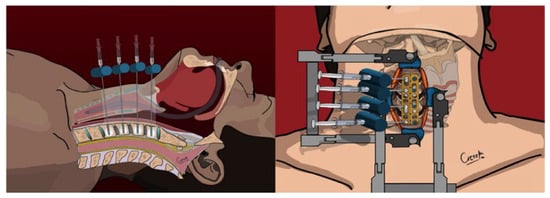 - Reyes-Soto, G.; Corona De la Torre, A.; Honda Partida, K.G.; Nurmukhametov, R.; Encarnacion Ramirez, M.J.; Montemurro, N. Clivus-cervical stabilization through transoral approach in patients with craniocervical tumor: Three cases and surgical technical note. Brain Sci. 2024, 14, 254. [Google Scholar] [CrossRef]