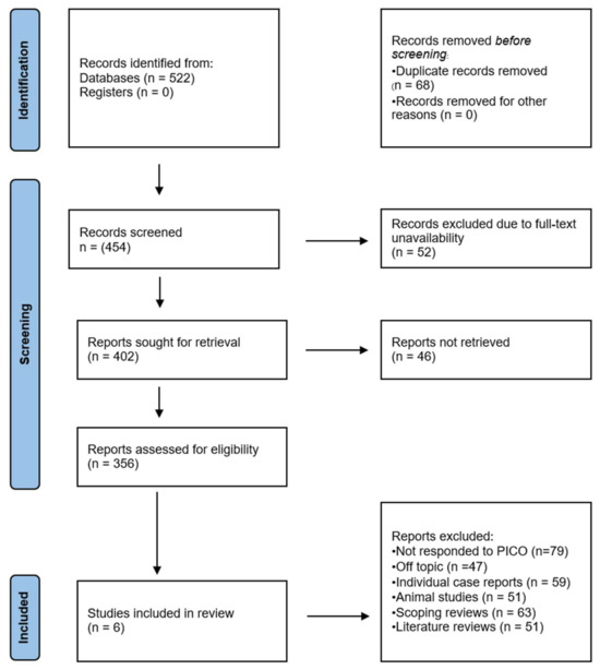 Figure 1 shows the steps involved in selecting studies, starting with the initial 522 entries that were retrieved from the databases of choice. Nothing was obtained from the register. After 68 duplicate records were eliminated, screening was performed on the 454 records that remained. A total of 52 records were excluded due to access concerns, leaving 402 records for additional review. Another 46 records could not be obtained for a thorough evaluation. A thorough eligibility evaluation was conducted on the remaining 356 records. In this stage, 79 records did not meet the predetermined PICO criteria, and 47 records were eliminated for being unrelated to the research subject. Due to their inconsistency with the inclusion criteria, 51 narrative reviews, 51 animal studies, and 59 scoping reviews were also eliminated during this review phase. Six papers [,,,,,] were found to be appropriate for inclusion in the systematic review when these criteria were applied.
