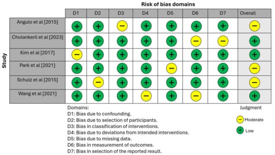 Park et al. [] maintained a low risk of bias in most assessed areas (D1, D2, D3, D4, D6, D7) but faced a moderate risk in domain 5 (D5). This led to an overall moderate risk of bias. Schulz et al. [] showed a low risk of bias across most domains except domain 2 (D2), where a moderate risk was identified. This resulted in an overall moderate risk of bias. Wang et al. [] presented a low risk of bias in most domains (D1, D2, D3, D5, D7) but incurred a moderate risk in domains 4 and 6 (D4, D6), which established an overall low risk of bias.