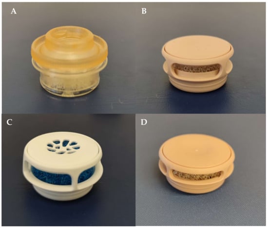 Figure 1. HME filters. (A) Bloom-Singer SpeakFree HME Hands Free Valve. (B) Laryvox HME Sport. (C) Provox® Life™ Energy HME. (D) Provox® Life™ Home HME. - -