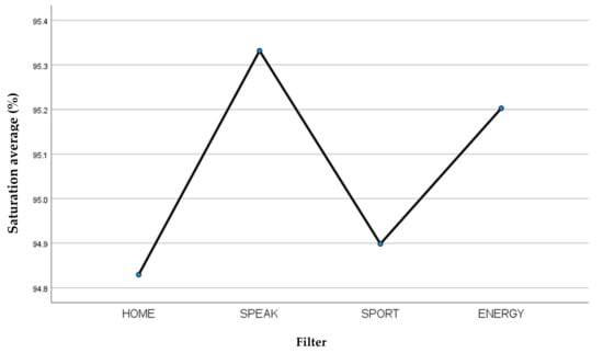 By using the saturation parameter as the dependent variable, a multiple comparison was carried out between the four filters studied. As can be seen from the Bonferroni test (Table 1) in terms of saturation, there is a significant difference between the Provox® Life™ Home HME filter and the Blom-Singer SpeakFree HME filter, and between the Blom-Singer SpeakFree HME filter and the Laryvox HME Sport filter. The Provox® Life™ Energy HME filter does not show significant differences with the other filters considered.