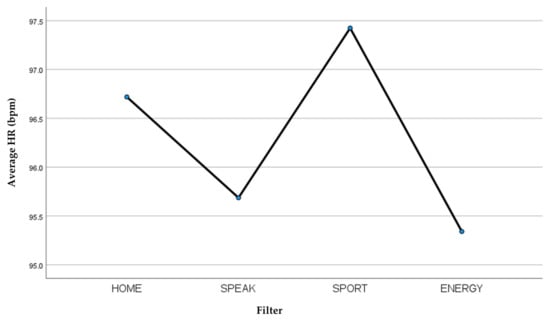Regarding the study of heart rate (HR) as a dependent variable in the multiple comparisons between the four filters studied, the Bonferroni test was applied, which did not find any significant differences (Table 3).