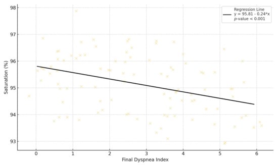 - The final dyspnea index presented a significant inverse correlation at the 0.01 level with saturation (Figure 8) and with meters traveled and a significant direct correlation at the 0.01 level with heart rate; this means that the subjects who reported higher values of perceived dyspnea after the 6 min of testing recorded, in the instrumental data, lower saturation values and lower number of meters traveled, whereas the heart rate had higher values;