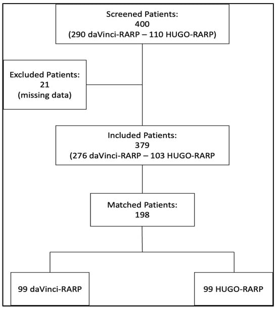 Out of 400 screened patients, 379 remained eligible after patients with missing data were removed—276 in the daVinci–RARP group and 103 in the Hugo–RARP group. Subsequently, 198 (52.2%) were matched according to the propensity score (Figure 1).