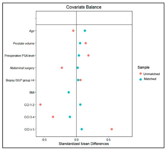 However, upon diagnostic graph assessment of covariate balance (Figure 2), a satisfactory balance in PS-matching of covariates was shown between Hugo–RARP and daVinci–RARP patients, except for age and BMI, which were slightly above the 0.1 cutoff point for the SMD (0.136 and −0.122, respectively). Nonetheless, these differences were considered nonsignificant, taking into account the p-values.
