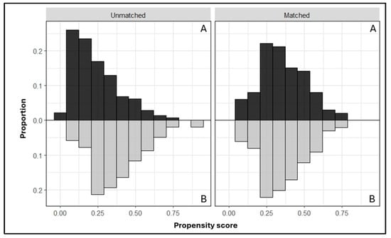 Assessing common support assumption required for propensity score matching procedure (A = daVinci–RARP group; B = Hugo–RARP).