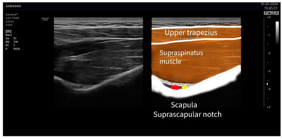 Ultrasound identification of the suprascapular nerve (in yellow) lateral to the artery (in red) at the suprascapular notch. The imaging shows the upper trapezius muscle as the most superficial muscle located over the supraspinatus muscle. The suprascapular notch is located in the deepest part of the suprascapular fossa.