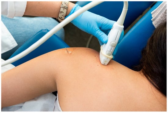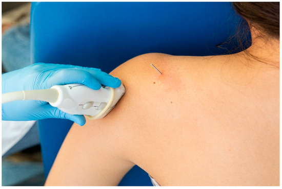 Patients allocated to the exercise plus PENS received four sessions (once per week) of 30 min duration of ultrasound-guided percutaneous electrical nerve stimulation targeting the suprascapular and axillar nerves. For PENS treatment, two needles, one in the axillar nerve and the other in the suprascapular nerve, were connected to an electro-stimulator (ENRAF NONIUS endomed 484, Madrid, Spain). Then, a biphasic square wave electrical current at a 2 Hz frequency with a 250-microsecond pulse width was applied (Figure 7). The intensity of the electrical current was increased to induce an involuntary contraction of the innervated muscles below the pain threshold.