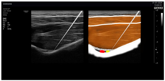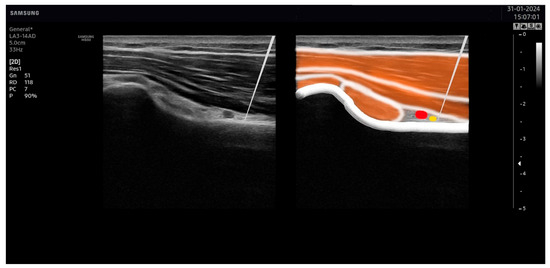 Needle placement on the axillar nerve. The tip of the needle was placed as close as possible to the axillar nerve (in yellow), avoiding the artery (in red).