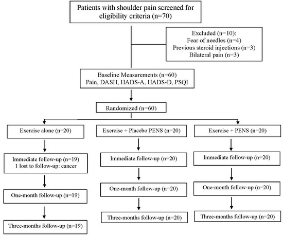 This randomized, parallel-group clinical trial compared the inclusion of PENS into an exercise program for subacromial pain syndrome. The primary endpoint was a three-month improvement in function and related disability. Secondary outcomes included shoulder pain and psychological aspects, such as anxiety levels, depressive symptoms, and sleep quality. This study adhered to the Consolidated Standards of Reporting Trials (CONSORT) extension for clinical trials [19].