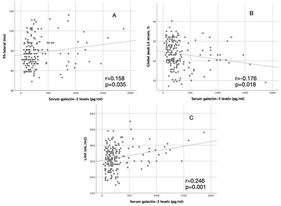 Serum galectin-3 levels were significantly higher in ESUS + PAF than in ESUS-PAF and control groups (479.0 pg/mL ± 435.8 pg/mL, 297.8 pg/mL ± 280.3 pg/mL, and 125.4 ± 87.0 pg/mL, p < 0.001, respectively). Serum galectin-3 levels were significantly correlated with LAVI, PA lateral, and global peak LA strain (r = 0.246, p = 0.001, p = 0.158, p = 0.035, r = −0.176, p = 0.018, respectively). Table 4 demonstrates correlation analyses of galectin-3 and LAVI, PA lateral, and global peak LA strain. Also, it is shown in a figure (Figure 1).