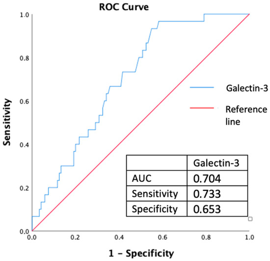 The optimal threshold of galectin-3 levels for diagnosing PAF was determined by using ROC analysis. 235.1 pg/mL serum galectin-3 levels predict PAF with 0.733 sensitivity and 0.653 specificity (AUC, 0.704; 95%CI, 0.614–0.794; p = 0.001) (Figure 2).