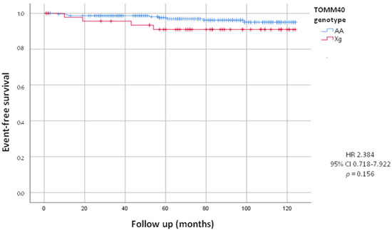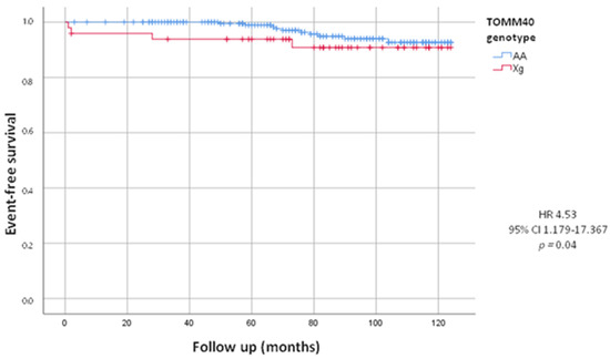 After a follow-up of 82.53 ± 30.02 months, we evaluated total combined incidence of deaths, MACE and PM/ICD implantations, as presented in Table 3. During the follow-up we recorded 65 (23.6%) MACE. We did not observe a statistically significant difference between the Xg and AA group (22.4% vs. 23.8%, HR = 0.94, 95% CI 0.493–1.802; p = 0.86). We also recorded 52 deaths, including 14 by cardiovascular events, 17 by cancers and 21 by other causes. We did not observe a statistically significant difference in deaths from all causes between the two groups (16.3% in Xg group vs. 19.4% in AA group, HR = 0.84, 95% CI 0.395–1.784; p = 0.62). The mean age of death was 78.46 ± 9.92 years, in detail 79.38 ± 5.04 years in Xg group and 78.30 ± 7.25 years in AA group (p = 0.63). Woth respect to AA, we found a higher mortality, statistically significant, from cardiovascular events in Xg carriers (8.2% vs. 4.4%; HR = 4.53, 95% CI 1.179–17.367; p = 0.04) with no difference of age (82.0 ± 5.29 y vs. 81.90 ± 8.34 y, p = 0.84). In Figure 1, Kaplan–Meier’s survival curves for cardiovascular deaths according to TOMM40 genotype were shown.