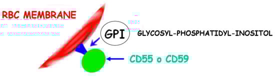 More than 10% of patients with aAA may progress to develop clinically significant paroxysmal nocturnal hemoglobinuria (PNH), a rare and life-threatening disease due to the activation of plasma complement (C3). PNH symptoms include hemolysis; dark urine, especially in the early morning (Figure 4); and blood clot formation. Flow cytometric analysis often reveals a subclinical presence of PNH phenotype in granulocytes among aAA patients, indicating an expanded PNH clone possibly due to its resistance against autoimmune conditions. Interestingly, aAA is a known risk factor for PNH development, and, conversely, some individuals with PNH may also develop aAA, suggesting a complex interrelation between both disorders [13]. The disease typically affects all blood lineages (erythroid, megakaryocytic, and granulocyte/monocytic), primarily due to somatic mutations in the PIGA gene. This mutation leads to the loss of the glycosylphosphatidylinositol (GPI) anchor, a complex structure comprising a phosphoethanolamine linker, glycan core, and phospholipid tail that links the proteins CD55 and CD59 to the RBC membrane (Figure 5). In PNH, the lack of GPI results in the loss of CD55 and CD59 proteins, in unregulated plasma complement C3 activation and intravascular hemolysis. The expansion of a single clone of PIGA mutant, GPI-negative hematopoietic cells, plays a crucial role in the pathogenesis of PNH, though the mechanisms behind this clonal expansion remain largely unexplored. The overlap between aAA and PNH is well recognized, with immunosuppressive therapy showing to improve survival rates in severe aAA cases, further highlighting the intricate relationship between these hematologic disorders [14].