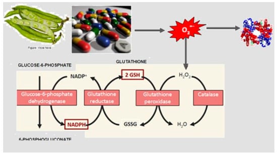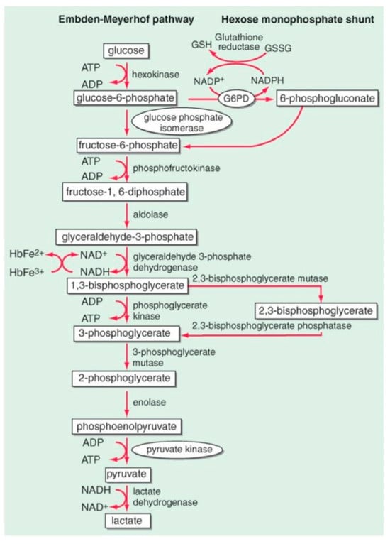 These are a group of genetic disorders that affect the RBC metabolism (Figure 8). They are caused by mutations in genes that code for RBC enzymes, and at least 16 genetically determined conditions qualify as red blood cell enzymopathies [21]. RBC enzymopathies range in frequency from ultrarare to rare, except for glucose-6-phosphate dehydrogenase deficiency (G6PD), which is very common. G6PD is characterized by an acute hemolytic crisis after the exposure of RBCs to an oxidant trigger (drugs, fava beans, or infections). In G6PD deficiency, the antioxidant metabolism is impaired, and its metabolic consequence is an important decrease in reduced glutathione (GSH), the metabolite that protects RBC against an excess of peroxidation or oxidative treats (Figure 9). The diagnosis can be quite easy, such as when a child presents with dark urine after eating fava beans, or one of the drugs listed in Table 2. However, it can be quite difficult, such as when an adult presents with chronic mild anemia and gallstones. Very far in frequency from G6PD is pyruvate kinase deficiency (PKD), a rare genetic disorder caused by mutations in the PKLR gene, which codes for the RBC pyruvate kinase (PK) enzyme. Symptoms of PKD are those of chronic hemolytic syndrome with onset often in the neonatal period [22].