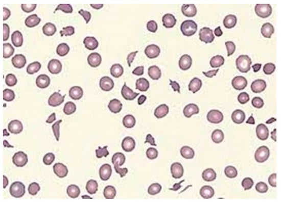 On the other hand, NIHAs are attributed to a variety of plasma or vascular factors that compromise RBC structure or function. A notable example is microangiopathic hemolytic anemia (MAHA), characterized by RBC destruction within small blood vessels due to conditions such as thrombotic thrombocytopenic purpura (TTP), hemolytic uremic syndrome (HUS), malignant hypertension, and disseminated intravascular coagulation [24]. MAHA presents anemia and broken RBCs (schistocytes) on the blood film (Figure 10). Diagnosing MAHA involves a four-step process that includes recognizing chronic hemolytic anemia, excluding acquired causes, and ruling out hemoglobinopathies, membranopathies, or enzymopathies through DNA testing against an appropriate gene panel. While many MAHA patients respond well to supportive care, including blood transfusions, iron chelation, and splenectomy in selected cases, some exhibit severe extraerythrocytic manifestations challenging to manage. In the absence of such complications, MAHA may be amenable to hematopoietic stem cell transplantation (HSCT), gene therapy, or gene editing.