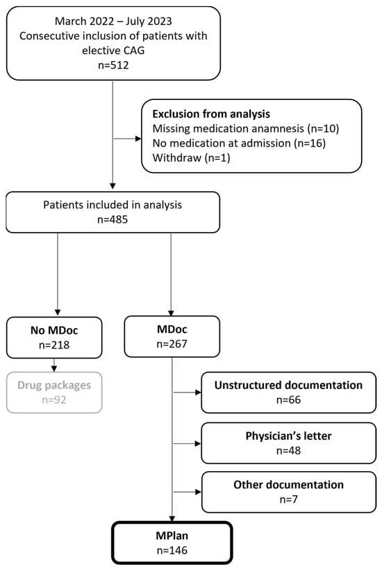 Flow chart of study population. Category “other documentation” comprises documenta-tions on mobile phones (n = 1), prescriptions (n = 3) and copies of packages (n = 3). MDoc—Medication documentation; MPlan—Medication plan.