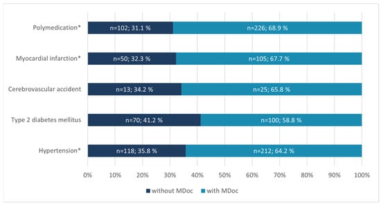 Overview of patient histories and polymedication status in relation to the presence of a MDoc in Austrian CAG-Patients at hospital admission. MDoc—Medication documentation; *—indicates a statistically significant difference (p < 0.05) for the marked variable.