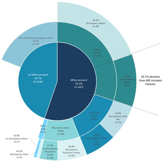 The MDocs patients brought along to the hospital were heterogenous and not standardized. The different categories of MDocs are shown in Figure 3. Whereas more than half of the patients with MDoc (n = 146 (54.7%)) had a MPlan, almost 25% of patients (n = 66 (24.7%)) used unstructured documentation of their medication. These unstructured MDocs were heterogenous in size and in 65.2% (n = 43) written by hand. Some examples of unstructured MDocs are presented in supplementary to highlight the broad variety (Figure S1).