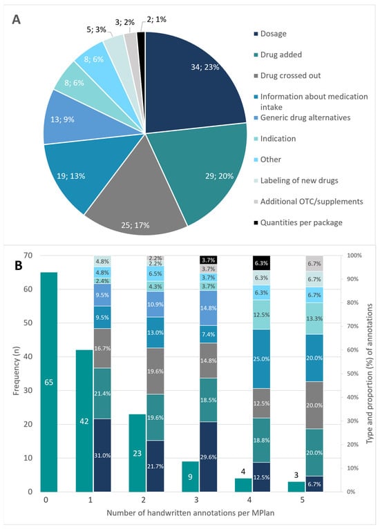(A). Type of handwritten annotations and frequency in total. (B). Frequency and number of handwritten annotations per MPlan. Type and proportion of handwritten annotations in context of the number of annotations are shown on the secondary axis; the color code for the annotation types in (A) is also valid for (B); MPlan—Medication plan; OTC—over-the-counter medication.