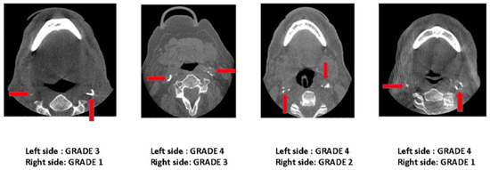 The ECACs were determined as calcifications in the cervical soft tissues lateral to the anterior tubercle of the transverse processes and posterolateral to the greater cornu of the hyoid bone and pharyngeal airway [7]. The calcifications were categorized as left, right, and uni/bilateral. In the case of bilateral ECACs, both the right- and the left-sided calcifications were graded individually, and the higher grade was considered the final grade for ECACs.