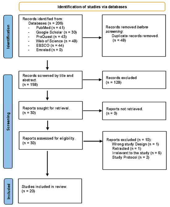 The literature search yielded 206 articles, of which 20 remained after applying the inclusion criteria. The study selection process is detailed in the PRISMA flow chart in Figure 1.