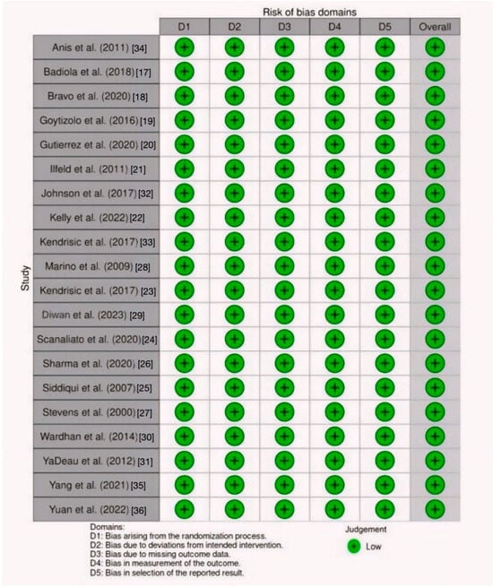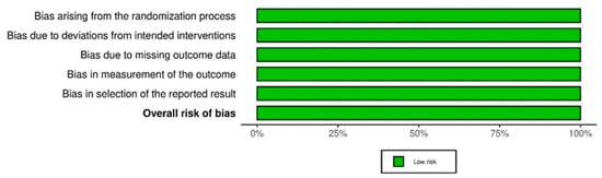 The Cochrane risk tool for bias was used to evaluate the quality of RCTs. The tool encompasses various domains, with each domain’s judgments contributing to an overall RoB2 judgment that spans five main domains. These domains are fixed, focusing on aspects of trial design, conduct, and reporting using a series of “signaling questions” to elicit information relevant to the risk of bias. This is then judged using an algorithm, and the judgments can be “low” (for all domains, the risk of bias is low), “some concerns” (for at least one of the domains, there is some concern), or “high” (for at least one domain, there is a high risk or some concerns for multiple domains). Two authors (R.B. and S.B.) independently conducted the risk of bias assessment, and after consulting with senior authors (M.N. and A.H.), they resolved disagreements through consensus [].