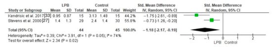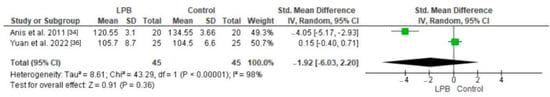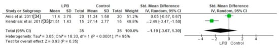 Forest plot comparing cortisol levels in LPB-treated patients and control groups without LPB [,].